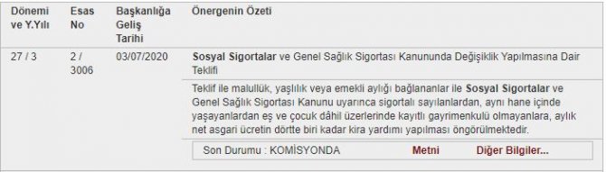 “Teklif ile malullük, yaşlılık veya emekli aylığı bağlananlar ile Sosyal Sigortalar ve Genel Sağlık Sigortası Kanunu uyarınca sigortalı sayılanlardan, aynı hane içinde yaşayanlardan eş ve çocuk dâhil üzerlerinde kayıtlı gayrimenkulü olmayanlara, aylık net asgari ücretin dörtte biri kadar kira yardımı yapılması öngörülmektedir.”