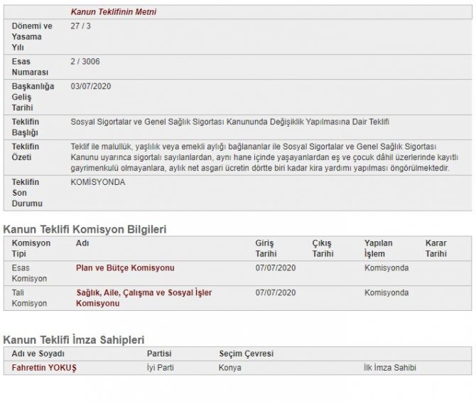 İYİ Parti Konya Milletvekili Fahrettin Yokuş tarafından Meclis’e sunulan “Sosyal Sigortalar ve Genel Sağlık Sigortası Kanununda Değişiklik Yapılmasına Dair Teklifi” kabul edilirse ihtiyaç sahiplerine aylık net asgari ücretin dörtte biri kadar kira yardımı yapılması öngörülmektedir. Bu da şu an 581 TL’ye denk gelmekte.