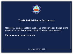 Kocaeli Valiliği’nden yapılan açıkladı. Motosiklet, scooter, elektrikli scooter ve motokuryelerin trafiğe çıkma yasağı 07/02/2025 Cuma günü saat 12:00’ye kadar uzatıldı.