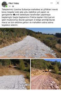 Sultaniye Mahalle Muhtarı Fikri Yıldız çalışmalardan duyduğu memnuniyeti sosyal medya hesabından yaptığı paylaşımla dile getirdi. Yıldız paylaşımında, “Taleplerimiz üzerine Sultaniye Mahallesi At Çiftlikleri Mevkii Koca Meşeler Eski Ada Yolu üzerinde İzmit Belediyesi tarafından yol genişletme çalışmaları ve stabilize malzeme serimi başladı. Başta Başkanımız Fatma Kaplan Hürriyet olmak üzere Fen İşleri Müdürü Burak Güreşen ve tüm ekibine şahsım ve mahallem adına teşekkür ederim” dedi.