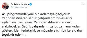 Sağlık Bakanı Fahrettin Koca, aşı programında yeni bir aşamaya geçilerek, bir grubun daha öncelikli gruplar arasına alındığını söyledi. Koca, yarından itibaren sağlık çalışanlarının eşlerinin de aşılanacağını açıkladı.