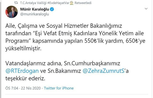 Antalya Valisi Münir Karaloğlu, Antalya Valiliği ve kendi resmi twitter hesabından yaptığı paylaşımda, Aile, Çalışma ve Sosyal Hizmetler Bakanlığı tarafından verilen “Eşi Vefat Etmiş Kadınlara Yönelik Yetim Aile Programı” yardımının 550 TL’den, 650 TL’ye çıkarıldığını duyurdu.