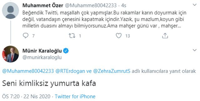 Vatandaşın yorumuna tepki gösteren Karaloğlu ise Twitter’dan vatandaşa, “Seni kimliksiz yumurta kafa” mesajını gönderdi.