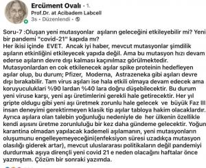 Sosyal medya hesabından paylaşım yapan Prof. Dr. Ovalı açıklamasında, “Oluşan yeni mutasyonlar aşıların geleceğini etkileyebilir mi” ve “Yeni bir pandemi ‘COVID-21’ kapıda mı” sorularına yanıt verdi. Prof. Ovalı yanıtında, ‘Her ikisi için de evet’ ifadesini kullandı.