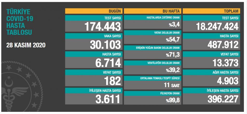 Sağlık Bakanı Fahrettin Koca, 28 Kasım tarihine ait Türkiye’deki korona virüs hasta ve vefat sayısını açıkladı. Bakan Koca’nın açıkladığı veriye göre Türkiye’de bugün 30 bin 103 kişiye korona virüse yakalandı. 182 kişi de korona virüs nedeniyle hayatını kaybetti. Son verilere göre hem vaka sayısında hem de vefat sayısında en yüksek döneme ulaşıldı.