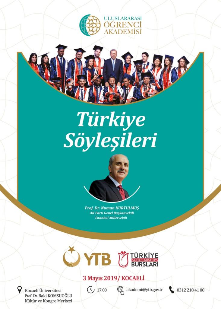 Kocaeli’de Yurtdışı Türkler ve Akraba Topluluklar Başkanlığı desteği ile Kocaeli Uluslararası Öğrenci Derneği işbirliğinde gerçekleştirilen Uluslararası Öğrenci Akademisi kapsamında ilk Uluslararası Öğrenci Akademisi kapsamında ‘Türkiye Söyleşileri’nin 11. dersini Kocaeli’de gerçekleştirmek üzere Prof. Dr. Numan Kurtulmuş ilimize geliyor.