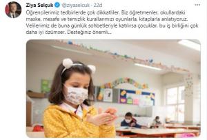 Milli Eğitim Bakanı Ziya Selçuk, ”Öğrencilerimiz tedbirlerde çok dikkatliler. Biz öğretmenler, okullardaki maske, mesafe ve temizlik kurallarımızı oyunlarla, kitaplarla anlatıyoruz. Velilerimiz de buna günlük sohbetleriyle katılırsa çocuklar, bu iş birliğini çok daha iyi özümser. Desteğiniz önemli…” dedi.