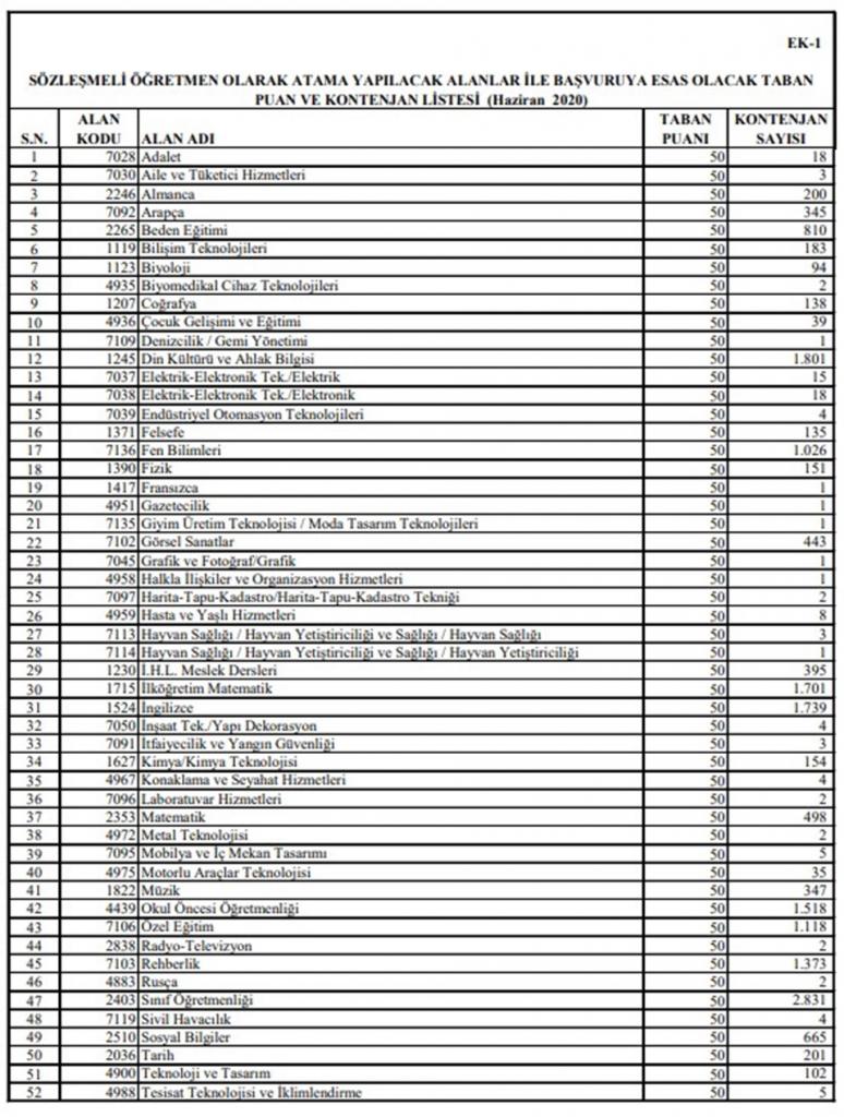 Milli Eğitim Bakanlığı 2020 Haziran Sözleşmeli Öğretmen atamaları kontenjan ve taban puan listesini yayımlandı.