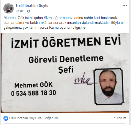 İzmit Öğretmenevi Müdürü Halil İbrahim Soylu, “Mehmet Gök isimli şahıs İzmit Öğretmenevi adına sahte kart bastırarak elaman alımı ve farklı imkânlar sunarak insanları dolandırmaktadır. Böyle bir çalışanımız yok tanımıyoruz” diyerek kamuoyunu bildirdi.