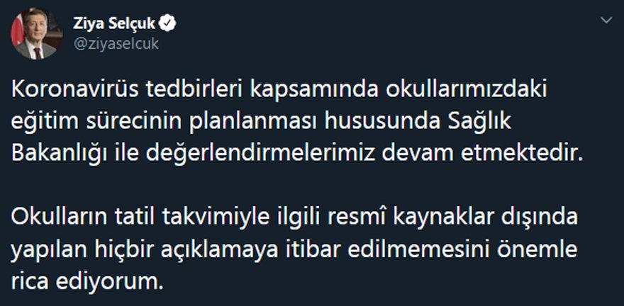 Sağlık Bakanı Fahrettin Koca’nın Corona virüsü salgını kapsamında okulların tatil edilip edilmeyeceğiyle ilgili Milli Eğitim Bakanı Ziya Selçuk ile görüşeceğini açıklamasının ardından vatandaşlar ne karar verileceğini merakla bekliyordu.
