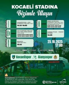 25 Ekim 2025 Cumartesi günü saat 17:00’de Alanyaspor’u Kocaeli Stadı’nda konuk ediyor. Kocaeli Büyükşehir Belediyesi, taraftarların stada ulaşımı için özel seferler düzenledi. Otogardan stadyuma ring seferleri saat 14:00 itibarıyla başlayacak.