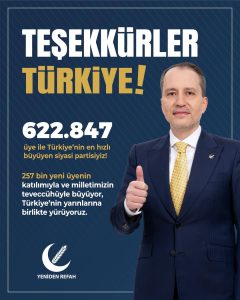 Yeniden Refah Partisi’ne katılımlar hızla sürüyor. Yeniden Refah’taki yükseliş Yargıtay Cumhuriyet Başsavcılığı’nın açıkladığı üye sayısıyla bir kez daha ortaya çıktı. Yeniden Refah Partisi üye kampanyaları ile de vatandaşların partiye katılımlarını sağlıyordu. Yeniden Refah Partisi üye sayısı bakımından Türkiye’nin 3. partisi durumunda.