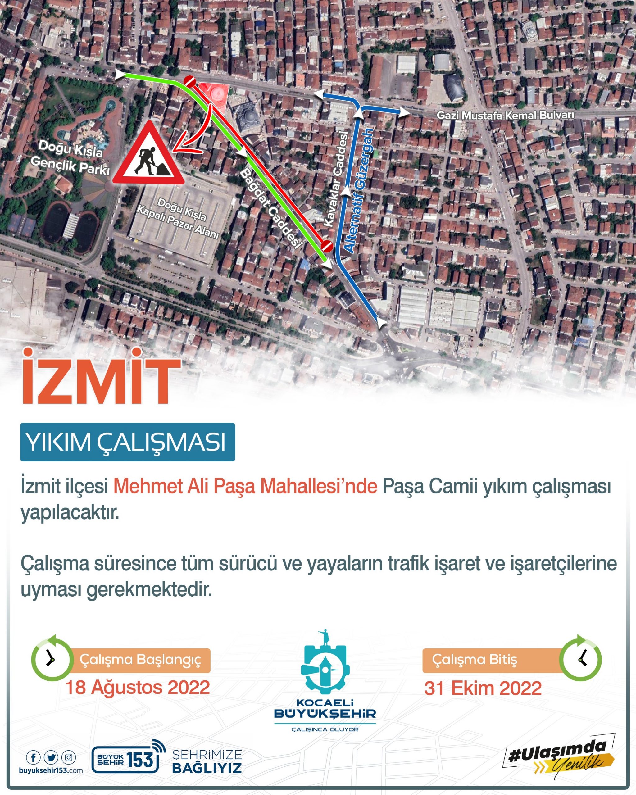 Kocaeli Büyükşehir Belediyesi Ulaşım Dairesi Başkanlığı tarafından yapılan duyuru ile Mehmet Ali Paşa Mahallesi’nde bulunan Paşa Camii’nin yıkım çalışmalarının bugün başlayacağı ve sürücülerin yıkım nedeniyle dikkatli olmaları konusunda uyarıda bulunuldu.