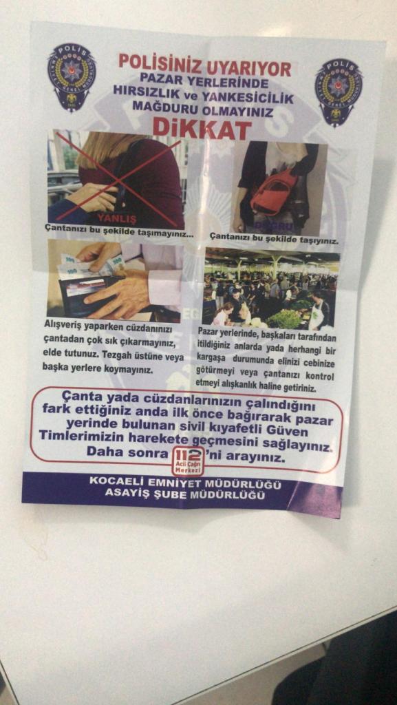 Kocaeli İl Emniyet Müdürlüğü Asayiş Şube Müdürlüğü Yankesicilik ve Dolandırıcılık Büro Amirliği ekipleri ile Toplum Destekli Polislik Şube Müdürlüğü ekipleri yaklaşan Kurban Bayramı öncesinde halkı bilinçlendirmek amacıyla İzmit ilçesinde bulunan Doğu Kışla Kapalı Pazar Alanı’nda kurulu Perşembe Pazarı’nda çalışma yaptı.