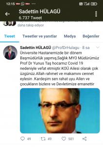 Kocaeli Üniversitesi Rektörü Sadettin Hülagü, Prof. Dr. Yunus Taş’ın ölümü üzerine sosyal medya hesabından şu paylaşımı yaptı: “Tıp Fakültesi Hastanemizde bir dönem Başmüdürlük yapmış, Sağlık MYO Müdürümüz Prof. Dr. Yunus Taş hocamız Covid-19 nedeniyle vefat etmiştir. KOÜ ailesi olarak çok üzgünüz. Allah rahmet ve makamını cennet eylesin. Kardeşim sen rahat uyu ailen ve çocukların bizlere ve devletimize emanettir”