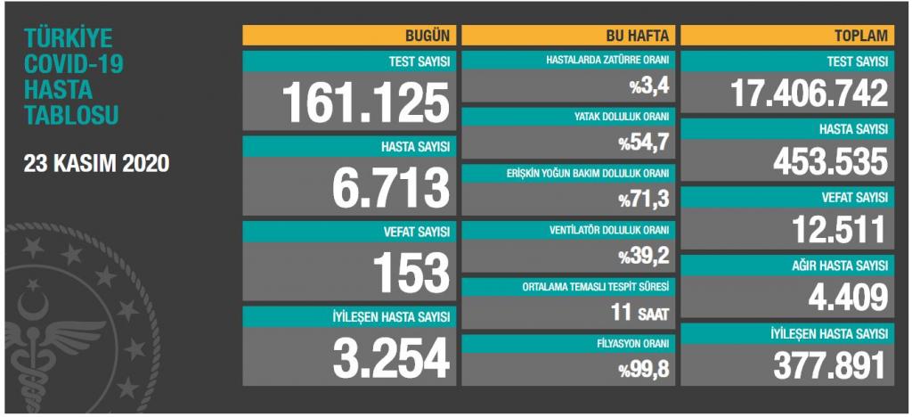 Bakan Koca, Twitter hesabından yaptığı açıklamada, “Bugün tespit edilen 6.713 yeni hastamız var. Aşı kullanıma girene kadar, salgının yayılma hızını kontrol altında tutmaya devam edebilmek için destek verin. Tedbirlere uyun. Maske takın. Temizliğe dikkat edin. Zorunlu olmadıkça kalabalık ortamlara girmeyin” dedi.