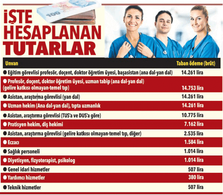 “Taban ödemesi memur maaşı artışına göre düzenli artacak, mahsup edilmeyecek. Böylece sağlık çalışanlarının aylığı, memur maaşı, sabit ödeme ve taban ödemesinden oluşacak. Eğitim kliniği başarısına göre asistanlara pozitif ayrımcılık yapılacak. Mesai sonrası görev yapan asistan hekimler ve hekim dışı personel ek ödemeden yararlanacak. Poliklinik hizmetlerinin teşvikte ağırlığı artırılacak. Çalışanların bireysel ve klinik iş yükleri, görev tanımları ve görev yaptıkları birim ile hizmetin elde edilme maliyeti dikkate alınacak. Döner sermaye ek ödemelerinde ülke genelindeki dengesizlik giderilip adil paylaşım sağlanacak. Hastanelerin teşvik ödemesinden tahakkuk, kaynak kullanım verimliliği, finansal sürdürülebilirlik ile kurum hedeflerine ulaşma gibi hususlar etkili olacak. Özellikle hizmetler teşvik edilmeye devam edilecek. Mesai sonrası çalışma, günlük işi yükü dikkate alınmak kaydıyla teşvik edilecek. Üniversitelerde olanlar dahil bütün sağlık çalışanlarının sabit ek ödemeleri merkezi yönetim bütçesine aktarılarak maaşa eklendi”
