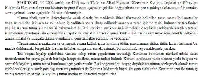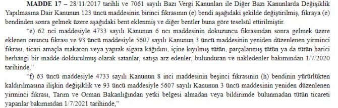 Resmi gazetede bugün yayınlanan değişiklikle beraber 1 Temmuz’dan itibaren ticari amaçla makaron veya yaprak sigarı kağıdının doldurulmuş şekilde satışına yasak getiriliyor. Ayrıca 1 Temmuz 2021 tarihinden itibaren de Tarım ve Orman Bakanlığından yetki belgesi almadan veya bildirimde bulunmadan tütün ticareti yapmak yasaklanacak.