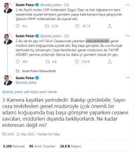 Sedat Peker, Twitter hesabından yeni paylaşımlarda bulundu. Peker, cezaevindeyken AKP’li Cumhurbaşkanı Recep Tayyip Erdoğan’ın Ceza Tevkifevleri Genel Müdürü’nü yanına yolladığını söyleyerek, koğuşunda görüştüklerini belirtti.