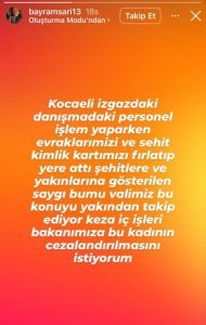 Baba Bayram Sarı, sosyal medya hesabından yaptığı bir paylaşımla duruma tepki gösterdi. Sarı, paylaşımında, İZGAZ’da işlem yaptırdığı sırada danışmadaki bir personelin, evraklarını ve kimlik kartını yere fırlattığını öne sürdü. Şehitlere ve şehit yakınlarına gösterilmesi gereken saygıya dikkat çeken baba Sarı, “Kocaeli İZGAZ’daki danışmadaki personel, işlem yaparken evraklarımızı ve şehit kimlik kartımızı fırlatıp yere attı. Şehitlere ve yakınlarına gösterilen saygı bu mu” ifadelerini kullandı. Paylaşımında konunun Kocaeli Valiliği tarafından yakından takip edildiğini belirten Sarı, ilgili personelin cezalandırılmasını talep ettiğini de sözlerine ekledi.