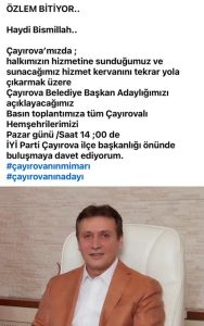 İYİ Parti Çayırova Belediye Başkan Adayı Şevki Demirci, 4 Şubat Pazar günü saat 14:00’de İYİ Parti Çayırova İlçe Başkanlığı önünde halkla buluşacak.