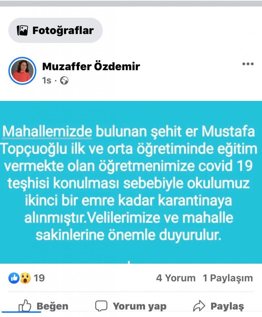 Kayseri’nin Sarıoğlan İlçesi, Karaözü Mahallesi’nde bulunan okulun ilk ve orta öğretiminde görevli 4 öğretmenden birine iddialara göre, korona virüs (covid-19) teşhisi konuldu. 63 öğrencisi bulunan okulun ikinci bir emre kadar karantinaya alındığı açıklandı