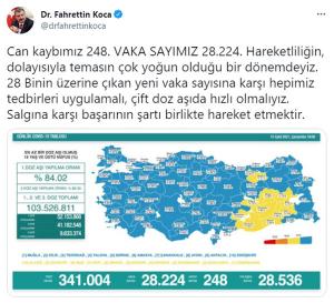 Tabloya göre son 24 saatte 28 Bin 224 yeni vaka tespit edildi, 248 kişi de korona virüs nedeniyle hayatını kaybetti.