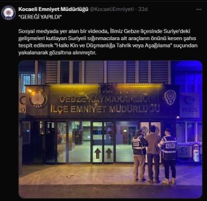 Sosyal Medya00Kocaeli’nin Gebze ilçesinde Suriye’deki gelişmeleri kutlayan Suriyeli sığınmacılara ait araçların önünü kesen şahıs gözaltına alındı. KOCAELİ EMNİYET MÜDÜRLÜĞÜ DUYURDU HABER MERKEZİ #kutlamagebzeGebze haberlerikocaelikocaeli emniyet müdürlüğüKocaeli Gündemkocaeli haberkocaeli sondakikaPolisSuriyeSuriyeliler