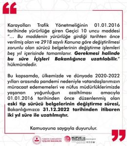 Nüfus ve Vatandaşlık İşleri Genel Müdürlüğü sosyal paylaşım sitesi Twitter hesabından yaptığı paylaşımda, “Karayolları Trafik Yönetmeliğinin 1 Ocak 2016 tarihinde yürürlüğe giren Geçici 10. maddesi ‘Bu maddenin yürürlüğe girdiği tarihten önce verilmiş olan ve 2918 sayılı Kanuna göre değiştirilmesi zorunlu olan sürücü belgelerinin değiştirme işlemleri 5 yıl içerisinde tamamlanır. Gerekmesi halinde bu süre İçişleri Bakanlığınca uzatılabilir’ hükmündedir.