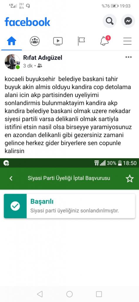 Rıfat Adıgüzel, Kandıra’ya çöp depolama alanı yapılacağını açıklayan Tahir Büyükakın’a tepki gösterdi. Adıgüzel sosyal medya hesabından yaptığı açıklamada, ‘Alınmış olan çöp depolama kararından dolayı Ak Parti üyeliğinden istifa etmiş bulunmaktayım. Kandıra AKP’de belediye başkanı da olmak üzere ne kadar siyasi varsa istifa etsin’ İfadelerini kullandı.