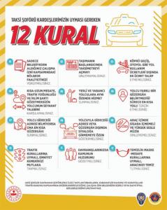 İçişleri Bakanlığı’nın yaptığı açıklamada, son zamanlarda taksilerle ilgili yaşanan sıkıntılar sebebiyle taksi şoförlerinin uyması gereken 12 kuralın yazılı olduğu görsel hazırlandığı duyuruldu.