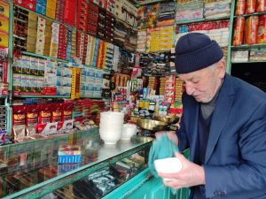 56 yıldır aynı dükkânda bakkallık yapan Cengiz Çelik, Ardahan merkezde yaşıyor, dükkânındaki düzenle dikkati çekiyor.