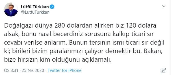 Enerji ve Tabii Kaynaklar Bakanı Fatih Dönmez’in, ez, “Avrupa doğal gazın bin metreküpünü 120 dolar civarında alırken, Türkiye’nin 280 dolara almasının nedeni nedir?” sorusuna “Ticari sır” yanıtını vermişti.