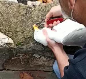 Kocaeli Başiskele İlçesi eski gölcük yolu üzerinde bulunan sahil şeridinde, sabah yürüyüşüne çıkan aile, bir martının deniz kenarında bulunan kayalıklara düştüğünü ve uçamadığını fark etti. Martıya yardım etmek için yanına yanaşan aile yaptıkları kontrollerde martının hem gagasına hem de bacakları ile kanatlarına kancalı misinanın dolandığını fark etti. Uçamayan ve oldukça güç nefes alan martıyı yakalayan ve video konuşmalarında ‘Seni uçuracağız’ sözü veren aile, ilk önce martının kanat ve bacaklarına dolanan misinayı yanlarında bulunan çakı ile kesti. Ancak gagasına ve diline dolanan kanca ile misinada martıyı kurtarmak hiç de kolay olmadı. Operasyon sırasında martının ağzını açık tutmakta zorlanınca, çevrede bulunan bir ağaç dalı gagasının arasına yerleştirildi. Ardından martı önce gagaya dolanan kancadan, sonrada diline dolanan misinadan kurtarıldı. Yaklaşık yarım saatlik operasyon ile kurtarılan martı daha sonra bırakıldığı gibi tekrara uçmaya başladı.