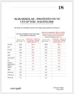 “Kararsızlardaki 12.5 puanlık Cumhur İttifakı kökenli seçmenin tavrı seçimin kaderini belirleyecek. Bunu çok iyi yönetmeleri lazım. Şu ana kadarki çalışmaları iyi götürüyorlar kanımca. Bir şeyler yapmaya çalışıyorlar ama şu ana kadar bildiğimiz kamuoyuna yansıyan çalışmalardan hareketle çok yavaş hareket ettiklerini, bir baskın seçim karşısında arabanın farı karşısındaki tavşana döneceklerini düşünüyorum.