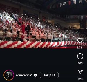 İzmit Belediyesi’nin ev sahipliğinde 1923 kadından oluşan dev koro ile birlikte seslendirdiği Cumhuriyet Marşı’ndan bir kesit paylaşan Arıca, hem kendi hislerini hem de etkinliğin coşkusunu takipçilerine aktardı. Yahya Kaptan’da bulunan Şehit Polis Recep Topaloğlu Spor Salonu’nda düzenlenen bu tarihi etkinlikte, Soner Arıca’nın Cumhuriyetin 100’üncü yılı için yazıp bestelediği marş, İzmit Belediyesinin kurduğu, 1923 kadının bir araya geldiği dev bir koro ile yankı buldu.
