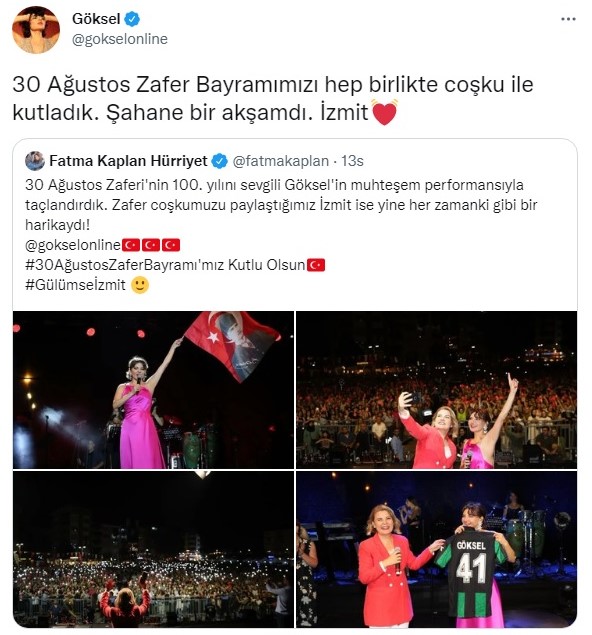 30 Ağustos Zafer Bayramı etkinlikleri kapsamında İzmit’te sahne alan ünlü şarkıcı Göksel, konserin ardından sosyal medya hesabı üzerinden yaptığı paylaşımda “30 Ağustos Zafer Bayramımızı hep birlikte coşku ile kutladık. Şahane bir akşamdı İzmit” ifadelerini kullandı.