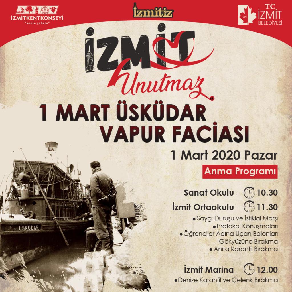 İzmit Belediyesi, 1 Mart 1958’de İzmit Körfezinde çoğu öğrenci olmak üzere 600 yolcusuyla İzmit iskelesinden hareket ettikten sonra aniden çıkan fırtınaya yakalanarak batan Üsküdar Vapurunda hayatını kaybedenleri, düzenlenecek programlarla anacak.