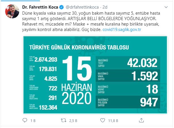 Sosyal medya hesabından açıklamada bulunan Koca, “Düne kıyasla vaka sayımız 30, yoğun bakım hasta sayımız 5, entübe hasta sayımız 1 artış gösterdi. Artışlar belli bölgelerde yoğunlaşıyor. Rehavet mi, mücadele mi? Maske + mesafe kuralına hep birlikte uyarsak, yayılımı kontrol altına alabiliriz. Güç bizde”