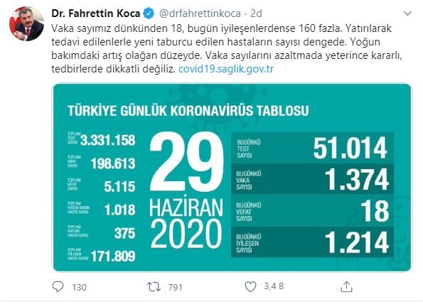 Sosyal medya hesabından açıklamada bulunan Bakan Koca, “Vaka sayımız dünkünden 18, bugün iyileşenlerdense 160 fazla. Yatırılarak tedavi edilenlerle yeni taburcu edilen hastaların sayısı dengede. Yoğun bakımdaki artış olağan düzeyde. Vaka sayılarını azaltmada yeterince kararlı, tedbirlerde dikkatli değiliz” dedi.