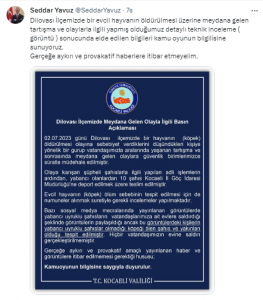 Bazı sosyal medya mecralarında yayınlanan görüntülerde yabancı uyruklu şahısların vatandaşlarımıza ait evlere saldırdığı şeklinde görüntülerin paylaşıldığı ancak bu görüntülerdeki kişilerin yabancı uyruklu şahıslar olmadığı köpeği ölen şahıs ve yakınları olduğu tespit edilmiştir. Hiçbir vatandaşımızın evine saldırı gerçekleştirilmemiştir. Gerçeğe aykırı ve provakatif amaçlı yayınlanan haber ve görüntülere itibar edilmemesi gerektiği hususu; Kamuoyunun bilgisine saygıyla duyurulur.”