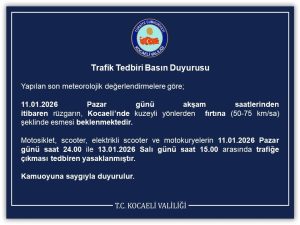 Kocaeli Valiliği tarafından yapılan açıklamada, “Yapılan son meteorolojik değerlendirmelere göre; 11.01.2026 Pazar günü akşam saatlerinden itibaren rüzgarın, Kocaeli’nde kuzeyli yönlerden fırtına (50-75 km/sa) şeklinde esmesi beklenmektedir. Motosiklet, scooter, elektrikli scooter ve motokuryelerin 11.01.2026 Pazar günü saat 24.00 ile 13.01.2026 Salı günü saat 15.00 arasında trafiğe çıkması tedbiren yasaklanmıştır. Kamuoyuna saygıyla duyurulur” ifadelerine yer verildi.