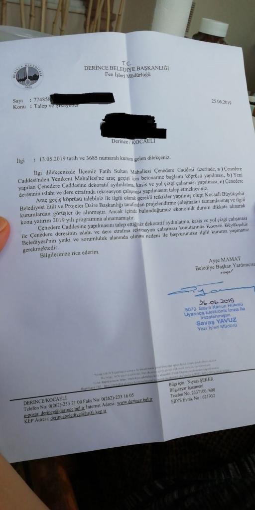 Mahalle sakinleri Belediyeye yaptıkları yazılı müracaatların Derince Belediyesi’nin Konuyu Büyükşehir’e atması, Büyükşehir’in ise İlçe belediyesine atması nedeniyle sahipsiz bırakıldığını ve bir türlü yetkililere seslerini duyuramadıklarını ifade ettiler.