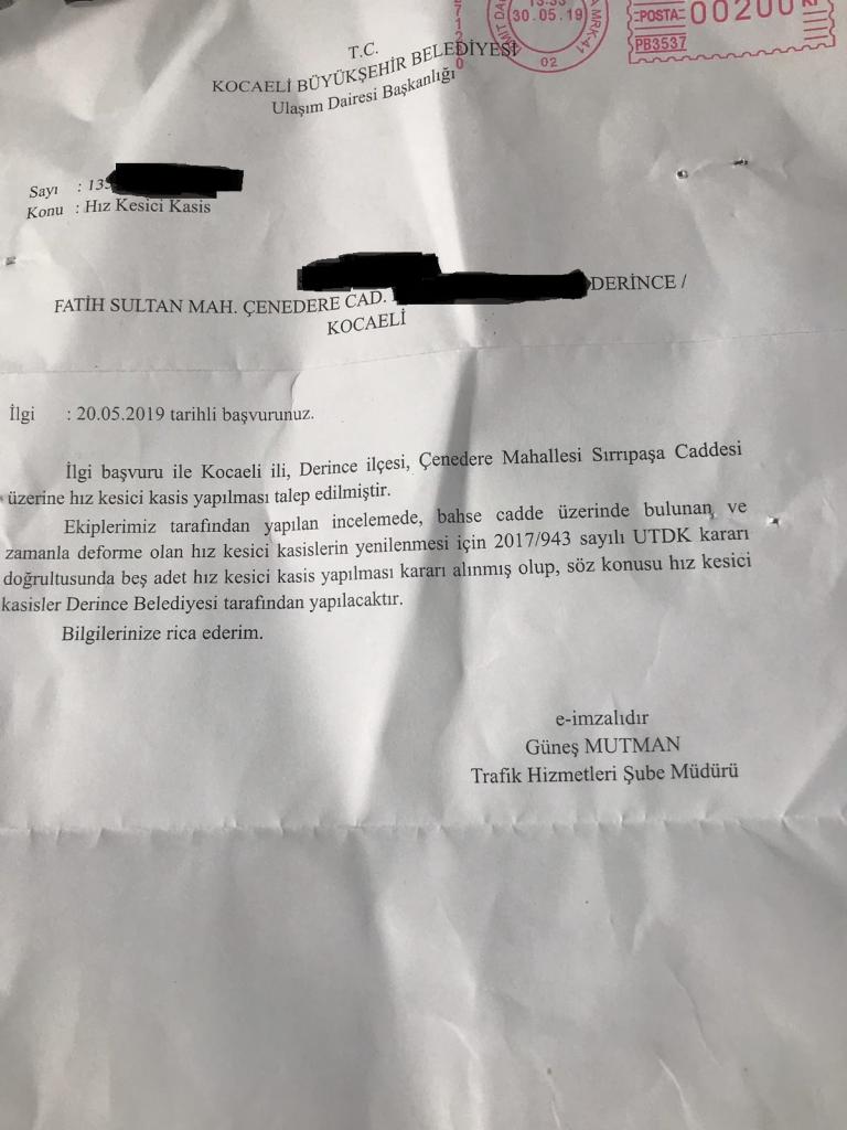 Yol yapımının üzerinden 1 yıl geçmesine rağmen yolda kasis olmaması nedeniyle araçlar adeta caddeyi yarış pisti gibi kullanıyorlar. Defalarca kez başvuru ve talepte bulunan mahalle sakinleri Caddenin başına ve sonuna bir sürü kasis yapıldı, ortasına ne herhangi bir düzenleme ne de herhangi bir kasis yapılmadı diyerek, yetkilileri göreve davet ettiler.