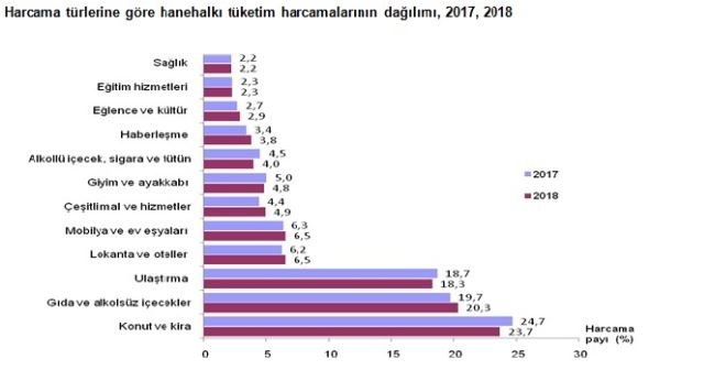 Türkiye İstatistik Kurumu (TÜİK) 2018 yılı Hanehalkı Tüketim Harcaması verisini açıkladı. Buna göre, hanehalkı bütçe araştırmasının 2018 yılı sonuçlarına göre; Türkiye genelinde hanehalklarının tüketim amaçlı yaptığı harcamalar içinde en yüksek payı yüzde 23,7 ile konut ve kira harcamaları alırken, ikinci sırayı yüzde 20,3 ile gıda ve alkolsüz içecek harcamaları aldı. Toplam tüketim harcamalarında en düşük payı alan harcama grupları ise yüzde 2,2 ile sağlık ve yüzde 2,3 ile eğitim hizmetleri oldu.