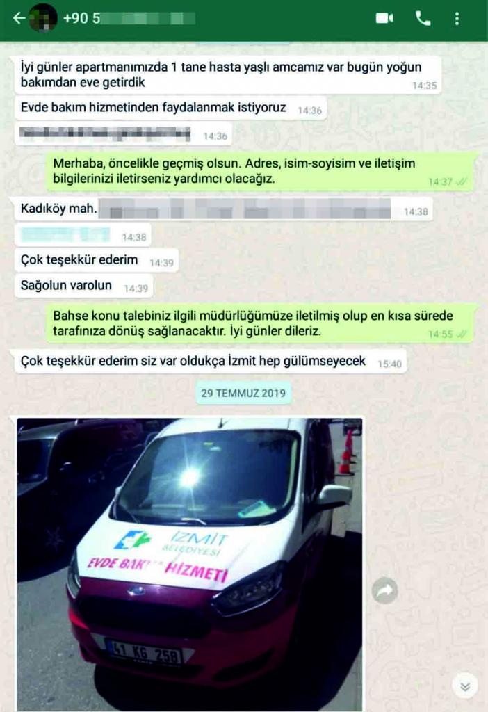 Yine Kadıköy Mahallesi’nde ikamet eden bir vatandaş WHATSAPP iletişim hattı üzerinden komşusu için belediyenin Evde Bakım Hizmeti talebinde bulunmuş, ilgili müdürlükte hemen harekete geçmiş ve vatandaşın talebine cevap vermiştir.