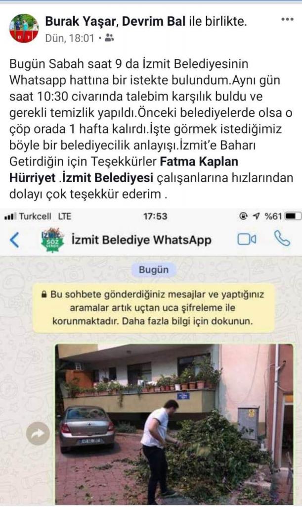 Çukurbağ Mahallesi Bahariye Cad. 1.Oya Çıkmazı No:6’da ikamet eden Burak Yaşar isimli vatandaştan sabah 09.00’da WHATSAPP iletişim hattı üzerinden gelen talep, belediye ekiplerince bir buçuk saat içerisinde yerine getirildi. Evinin bahçesinde yapılan budama işlemi sonrasında ortaya çıkan çöp ve ağaç birikintilerinin alınmasını isteyen Burak Yaşar, belediye ekiplerinin hızlı müdahalesi karşısında şaşkınlığını gizleyemedi. Bu memnuniyetini sosyal medya hesaplarında da paylaşan Burak yaşar, İzmit Belediye Başkanı Fatma Kaplan Hürriyet ve ekiplerine teşekkür etti.