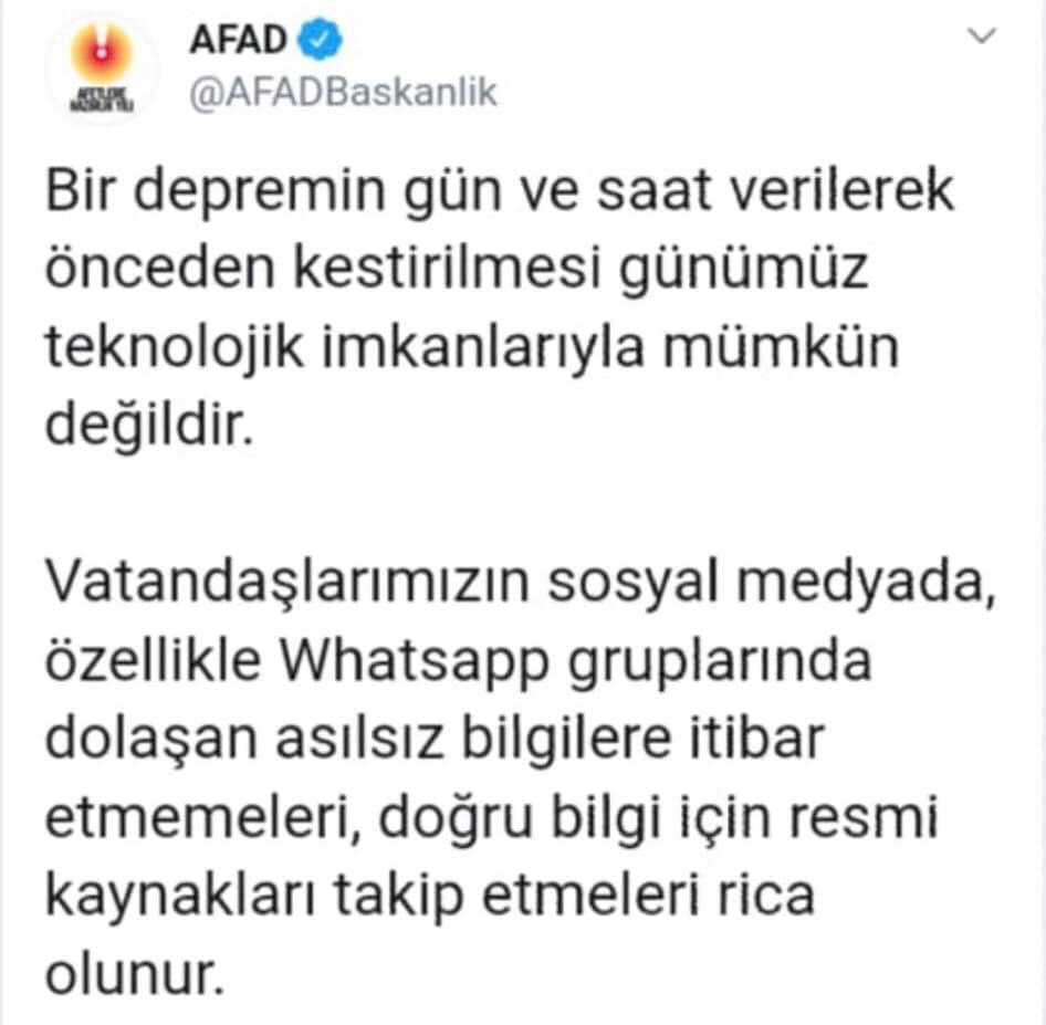 T.C İçişleri Bakanlığı Afet ve Acil Durum Yönetimi Başkanlığı (AFAD), sosyal medyada dolaşan söylentilere aldırış edilmemesini istedi. Yapılan açıklamada ‘Bir depremin gün ve saat verilerek önceden kestirilmesi günümüz teknolojik imkanlarıyla mümkün değildir. Vatandaşlarımızın sosyal medyada, özellikle Whatsapp gruplarında dolaşan asılsız bilgilere itibar etmemeleri, doğru bilgi için resmi kaynakları takip etmeleri rica olunur.’ İfadeleri kullanıldı.