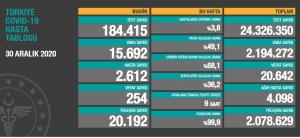 Sağlık Bakanı Fahrettin Koca, 30 Aralık tarihine ait Türkiye’deki korona virüs hasta ve vefat sayısını açıkladı. Bakan Koca’nın açıkladığı veriye göre Türkiye’de bugün 15 bin 692 yeni hasta tespit edildi, 254 kişi ise hayatını kaybetti.