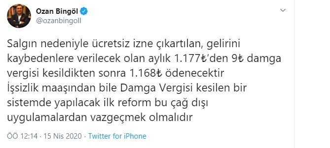 Ozan Bingöl, Twitter’dan yaptığı açıklamada ücretsiz izne çıkarılanlara verilecek olan aylık 1.177 TL’den 9 TL damga vergisi kesileceğini ifade ederek 1,168 TL ödeneceğini belirtti.